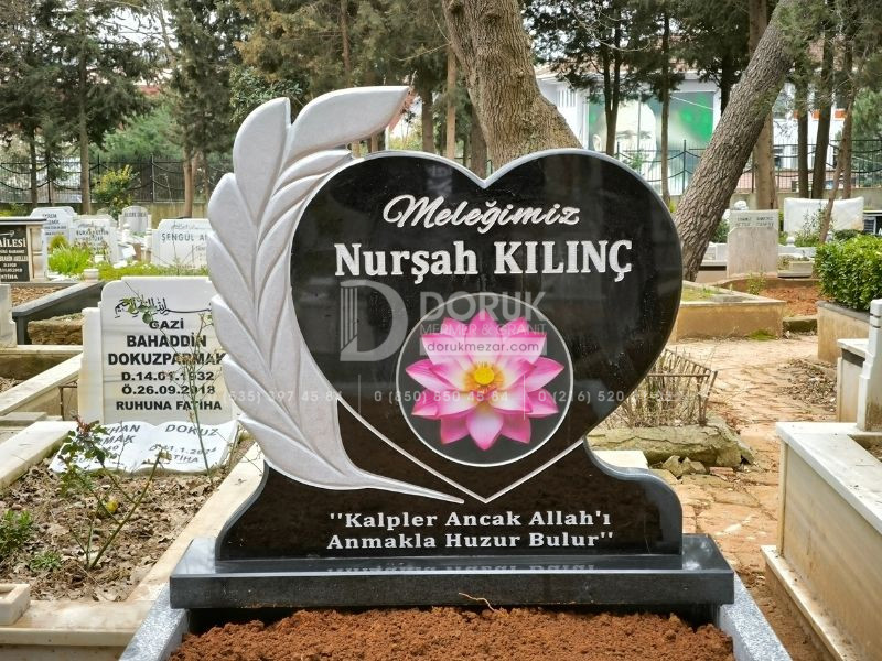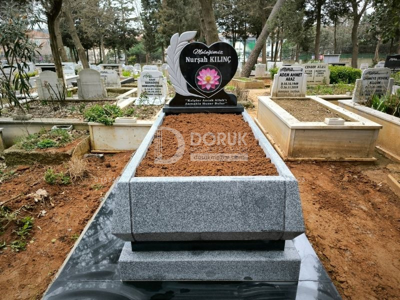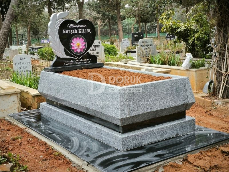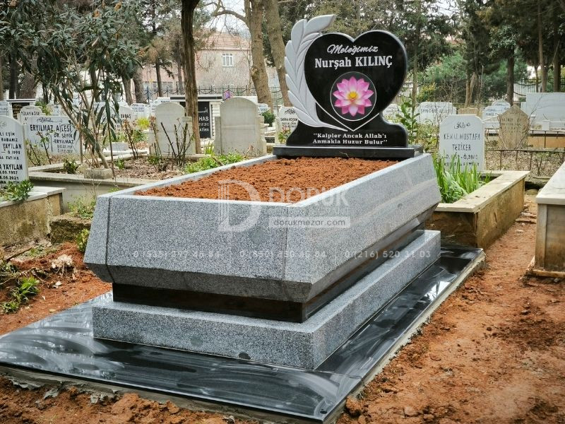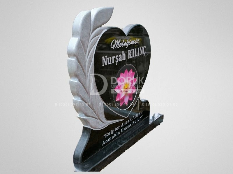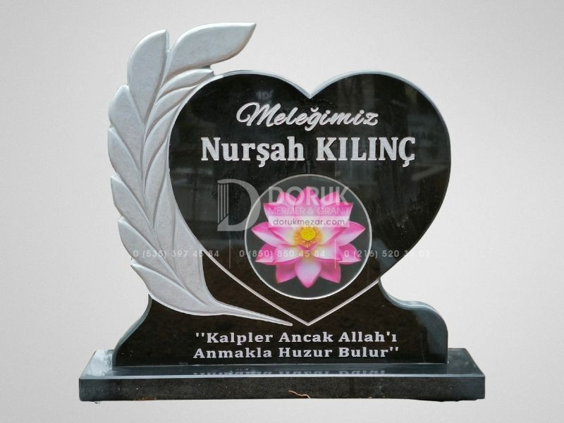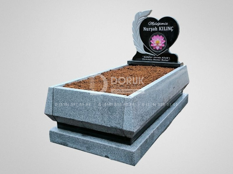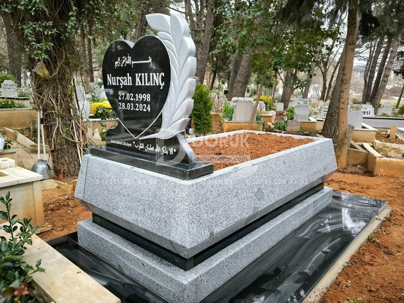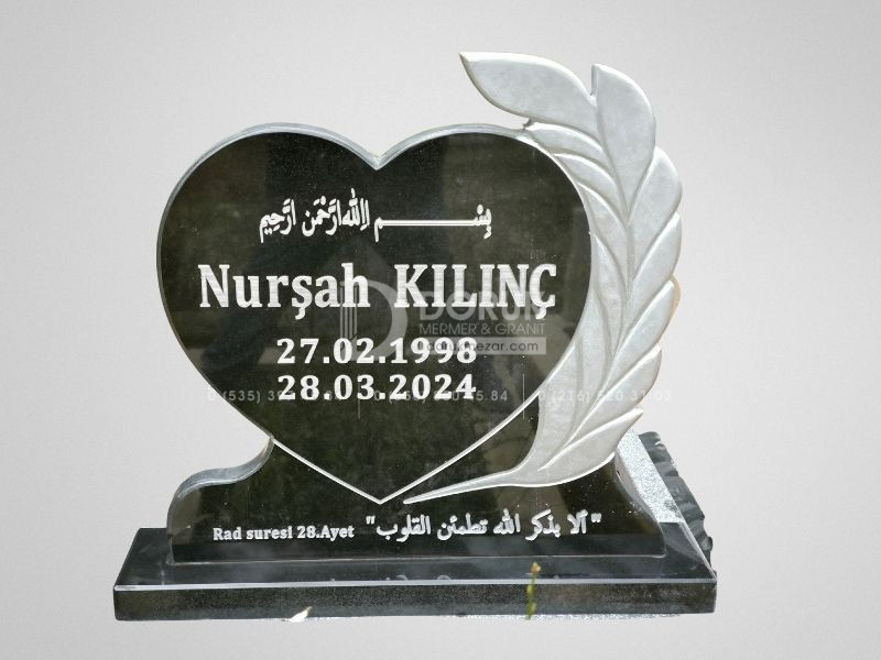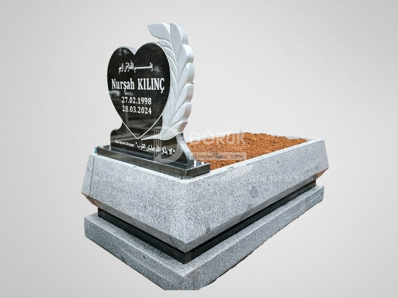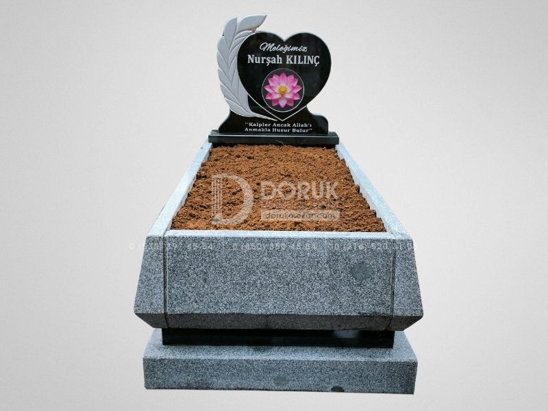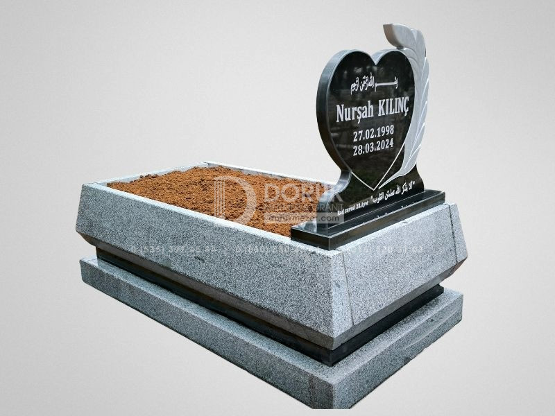 • Siyah Granit Kalp Baştaşı: Modelin odak noktası, CNC kesim teknolojisiyle kusursuzca şekillendirilmiş, parlak siyah granit kalp baştaşıdır. Kalp formu, sevdiklerinize duyduğunuz sonsuz sevgi ve bağlılığı sembolize eder.